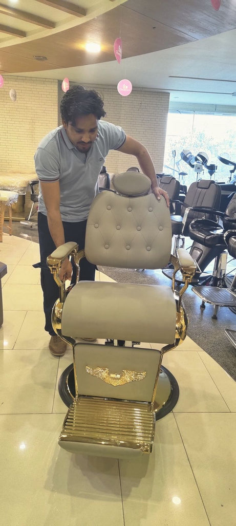 The Sovereign Executive is a luxury reclining barber chair designed for elite grooming studios. Featuring a sophisticated stone grey tufted upholstery and ornate gold-finished metalwork, this chair serves as a high-end statement piece. It combines vintage-inspired craftsmanship with modern heavy-duty performance, offering a full range of reclining motions for precision shaves and maximum client relaxation.