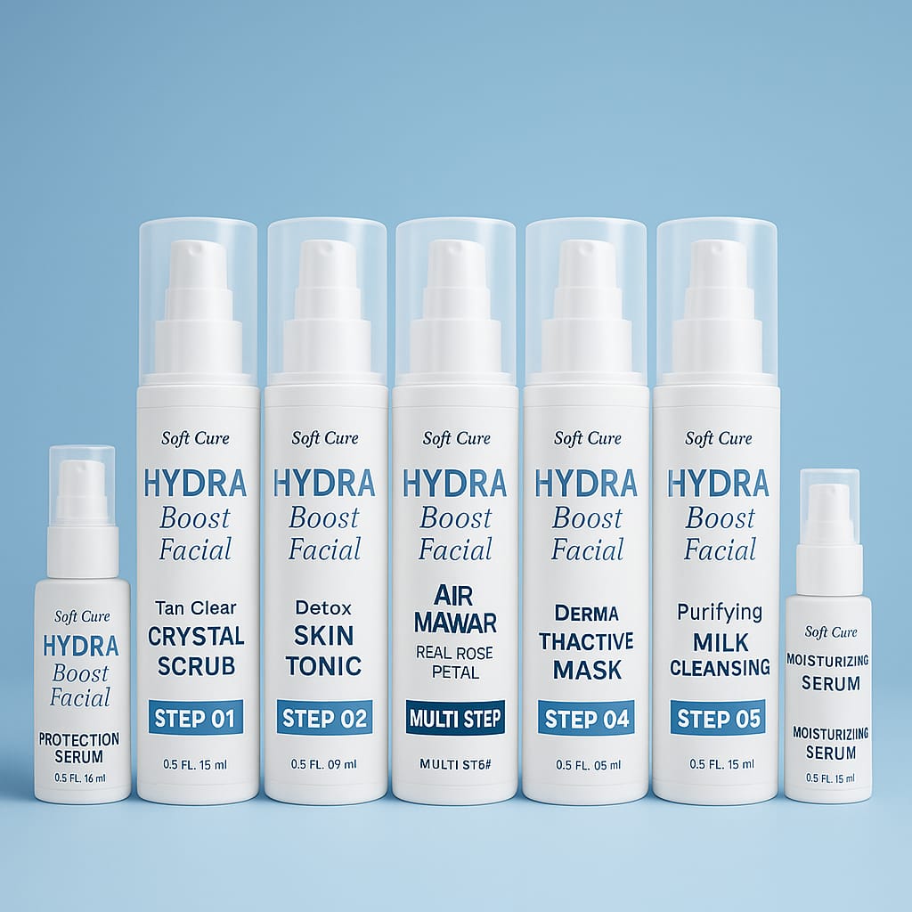 Instantly quench thirsty skin. The Soft Cure Hydra Boost Facial Kit is a professional 6-step treatment designed to transform dry, tired skin into a dewy, radiant masterpiece. Powered by moisture-locking technology, it plumps fine lines and restores a healthy "glass-skin" glow in just one session.